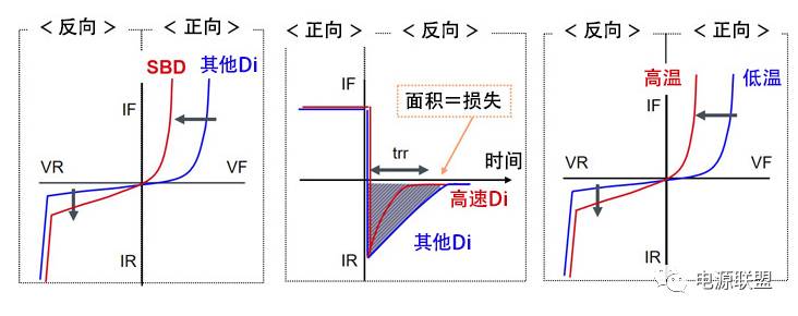 再重復(fù)一遍,左圖表示SBD與其他三種二極管相比,VF較低,IR較大。
