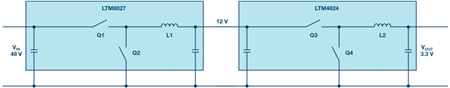 圖2.電壓分兩步從48 V降至3.3 V,包括一個(gè)12 V中間電壓。