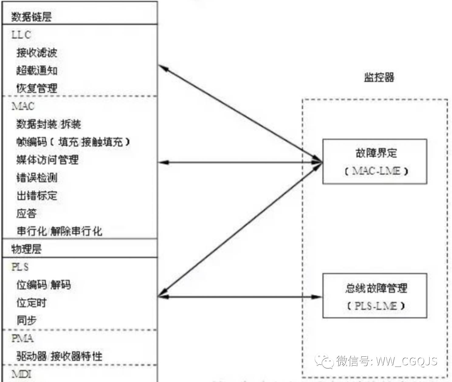 MAC子層運(yùn)行借助稱之為“故障界定實(shí)體(FCE)”的管理實(shí)體進(jìn)行監(jiān)控。故障界定是使判別短暫干擾和永久性故障成為可能的一種自檢機(jī)制。物理層可借助檢測(cè)和管理物理媒體故障實(shí)體進(jìn)行監(jiān)控(例如總線短路或中斷,總線故障管理)。
