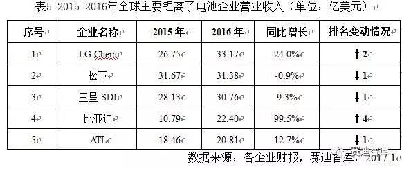 2016年全球充電機充電鋰離子電池產(chǎn)業(yè)企業(yè)格局較2015年發(fā)生了明顯變化。LG Chem憑借24%的增速躍居至全球首位,首次超過松下、三星,主要原因在于其動力充電機充電電池被各大電動汽車領(lǐng)域廣泛采用;松下下滑至第二,2016財年充電機充電鋰離子電池業(yè)務(wù)收入較2015財年小幅下滑,主要在于消費類產(chǎn)品需求下降而動力充電機充電電池大客戶特斯拉增幅有限;三星SDI降至全球第三,受Note 7爆炸事件影響2016年增速出現(xiàn)了明顯下滑。比亞迪憑借將近100%的增速一舉超過包括ATL、索尼等在內(nèi)的企業(yè)躍升全球第四,ATL位居第五,兩者差距十分微小,但比亞迪和ATL與全球前三的差距較大。